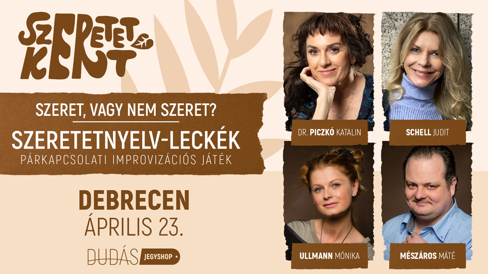 Az este folyamán Dr. Piczkó Katalin (pszichiáter, tréner, coach, a Szeretetkert könyvek szerzője) és színészek segítségével játékos formában tanulhatunk saját magunkról, a párunkról és a kapcsolatról.